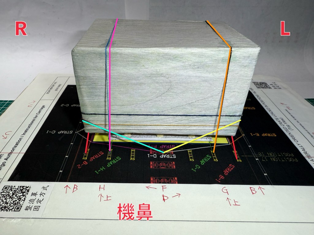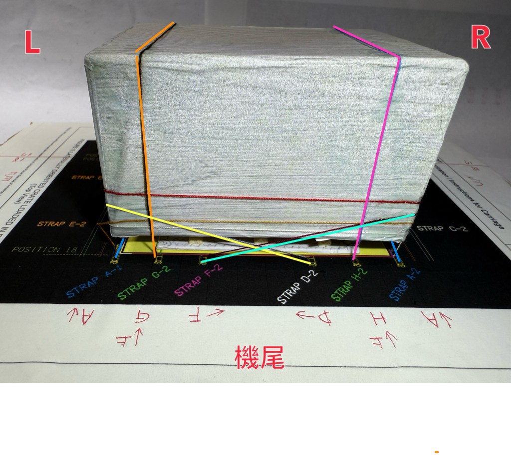 - 使用八條 TSO C172 貨物帶,通過使用 RH Fan Cowl Assembly 來固定貨箱,說明如下: