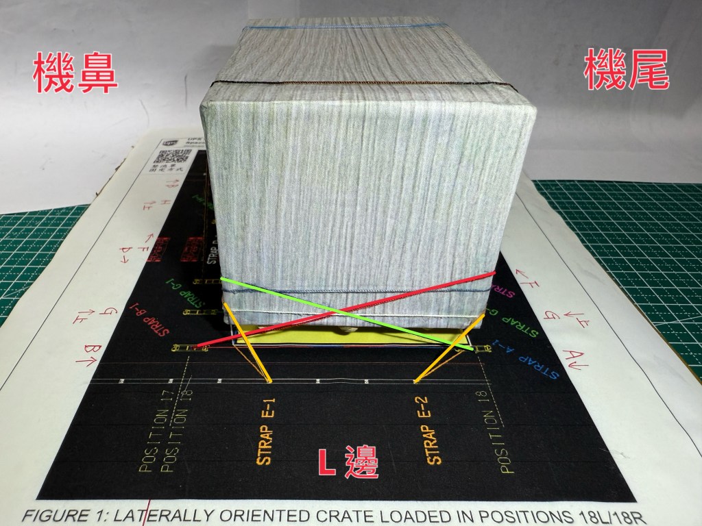 E. 將綁帶 E 固定在左側導軌上 17L/18L 位置鎖扣後方的第二個側導軌繫緊裝置上。將綁帶繞過板條箱的前部和右側,將綁帶 E 的自由端繞過板條箱後部,固定到左側導軌上 18L 位置後鎖扣前方的第一個側導軌係緊裝置上。確保:每條帶子和地面的角度均保持在30度以內。將綁帶 E 的自由端固定在左側導軌上 18L 位置後鎖扣前方的第一個側導軌係緊裝置上。 - F. 將綁帶 F 固定在板條箱前方第一個中心線導引係緊裝置上。將綁帶繞過板條箱的前部和右側,然後將綁帶 F 的自由端繞回板條箱後部,並沿著 18L 後鎖線將其固定在內側端擋塊上。確保:每條帶子和地面的角度均保持在30度以內。。