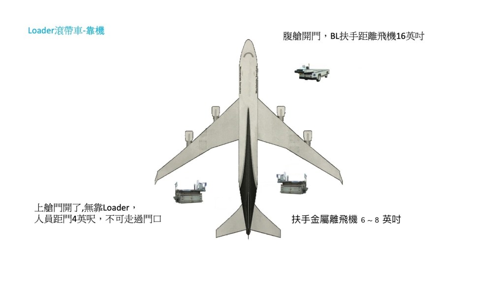 Loader 扶手金屬距離飛機 6到 8吋(8吋內不可碰觸飛機),前平台前延距離飛機 2到 5吋