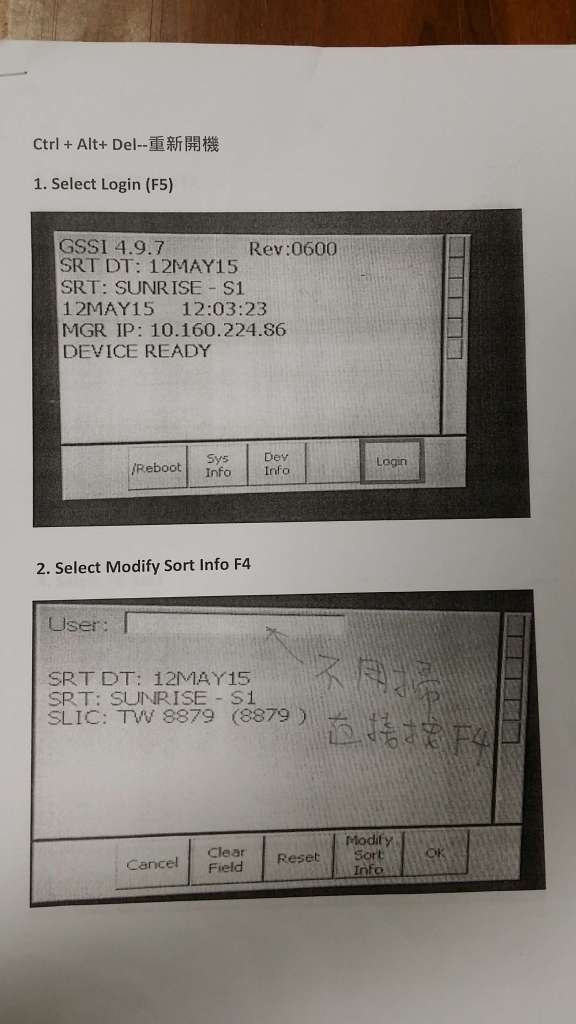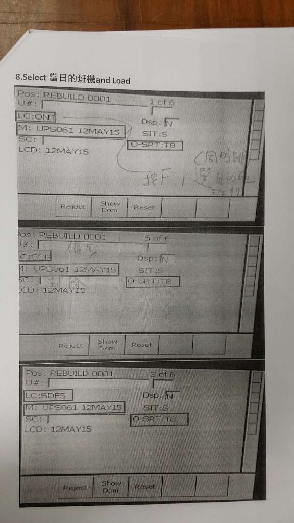 F5登入,F4跳過,Login,User自己條碼,1-Outbourd Enter,(Enter position forLoad Setup,(REBUILD,3)在此畫面可ULD SCAN 找還要再加打的櫃子, Bksp退回鍵,LC:ONT(按F1變更),ESC往後退,主畫面F5,F4 改日期,F2 Sort選T8,